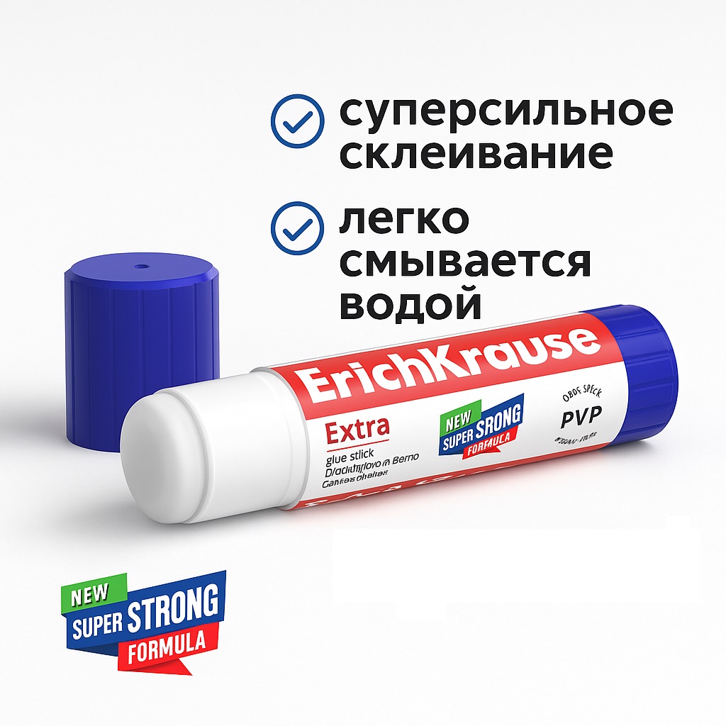 Клей-карандаш Extra c новой суперсильной формулой на PVP основе с экономичным расходом, максимально быстрым и надежным склеиванием. Легко смывается водой. Не токсичен. Не содержит растворителя. Морозостоек. Подходит для бумаги, картона и ткани.