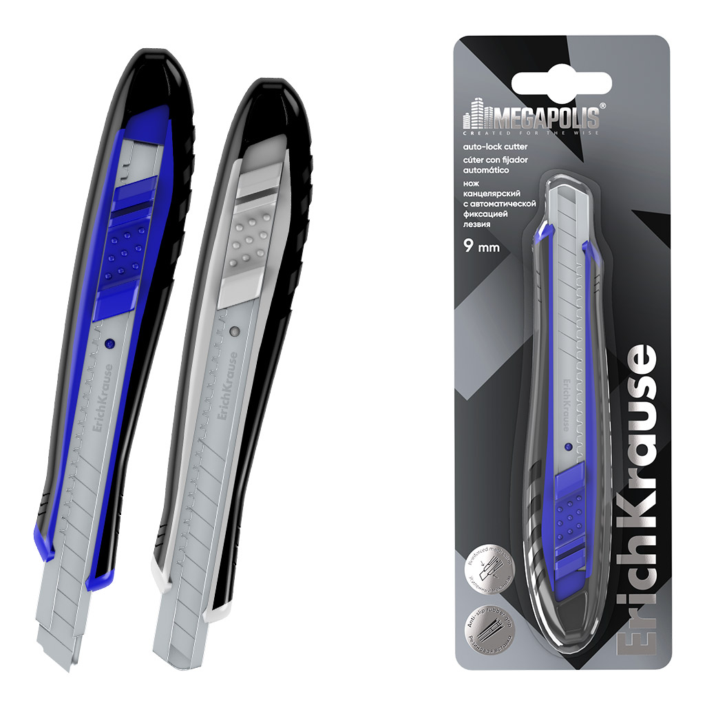 Нож канцелярский с механической системой фиксации лезвия push-lock и насадкой для безопасного отделения сегмента лезвия. Корпус ножа изготовлен из легкого и прочного пластика. Комплектуется износостойким стальным сегментированным лезвием с двухсторонней заточкой. Товар поставляется в нескольких вариантах цвета/дизайна без возможности выбора.