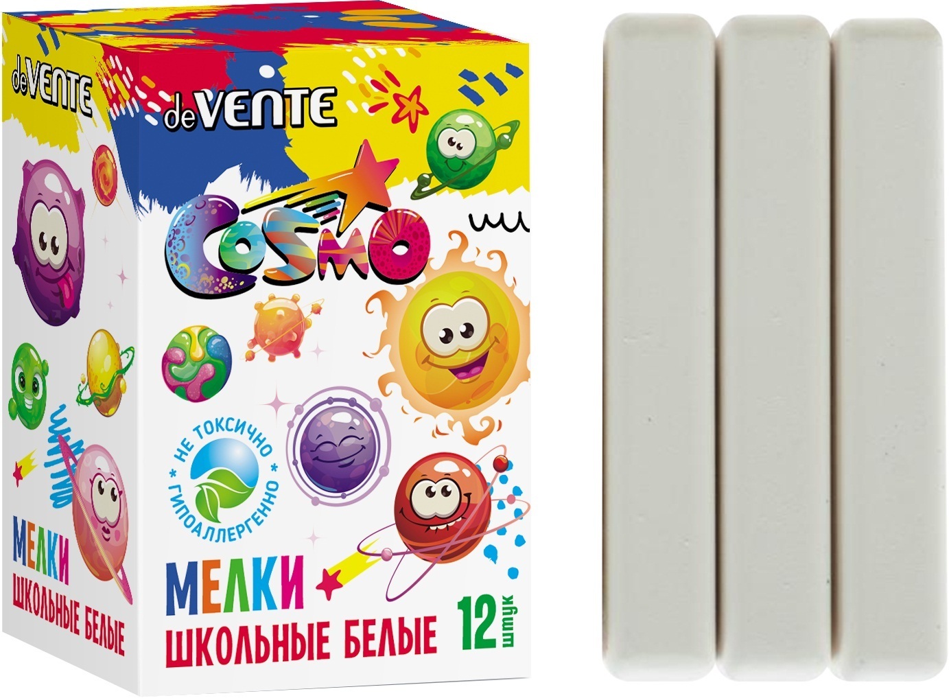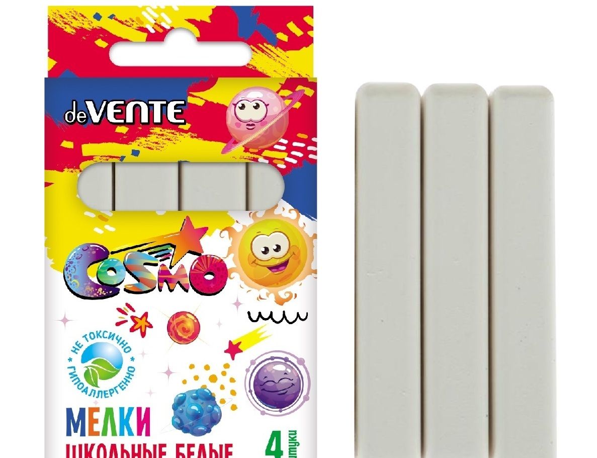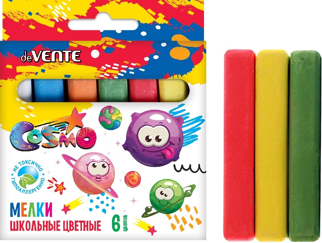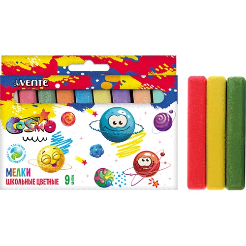 Удобная форма и мягкое письмо. Натуральный состав на основе мела, гипса, воды и пигментов, без выраженного запаха. Мелки нетоксичные. Средняя твёрдость. Следы мелков легко счищаются с рук. Набор упакован в картонную коробку с европодвесом. Предназначен для детей старше 3-х лет.