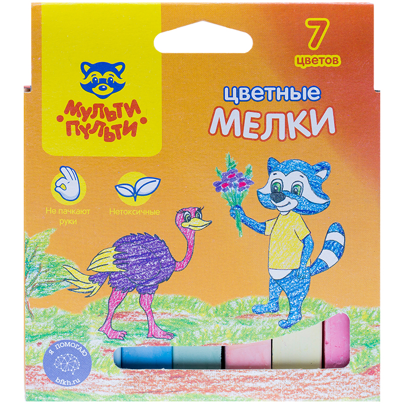 Набор из 7 квадратных мелков Мульти-Пульти «Енот в Австралии» для письма на досках состоит из 7 цветов ассорти: зелёного, синего, жёлтого, красного, оранжевого, белого, сиреневого.